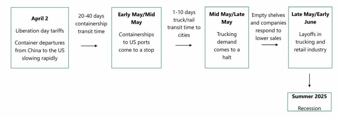 按其时间表所述,第一波次将在5月上旬至中旬发生。在经历三个阶段后,在2025年夏季,美国经济陷入衰退,具体“四步走”的阶段如下: